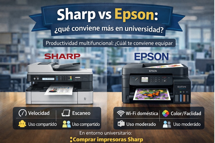 En entorno universitario, elegir impresora no es tema de “marca favorita”. Es un tema de volumen, costo real por página, escaneo, conectividad y tiempo de inactividad (cuando falla, se pierde tiempo y se genera cola). Sharp y Epson compiten, pero suelen encajar mejor en escenarios distintos: una se asocia más con oficina/operación y la otra con uso doméstico-académico (incluyendo opciones de color accesible).